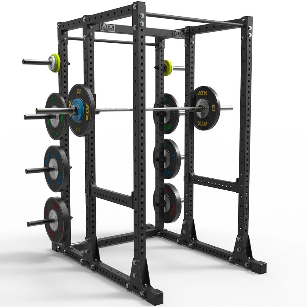 The 750 Power Rack with weights plates storage. This cage adaption showcases what’s capable from the configuable 700-series from ATX; the ATX PCX-750 Power Cage has the basic straight-bar pull-up bars and 8 storage weight horns, suitable for 450mm diameter olympic weight plates. This cage superceeds the Barbarian Pro Power Cage, but, has the distinct advantage of optional accessories and a cheaper price-point, despite being a better product. The footprint of the PCX-750 Power Cage is the same as the PRX-750 Power Rack, as the baseframe is the same unit.