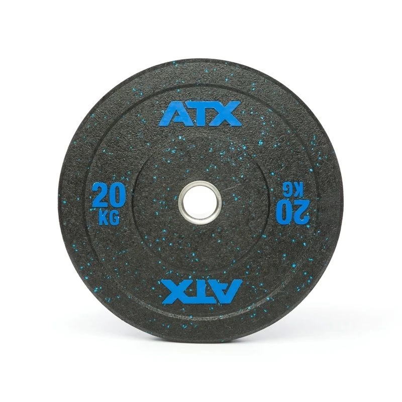 The ATX Soft Rubber Bumper Plates are softer than most bumper plates, coming in at 68 shore on the hardness scale, compared to 90 shore of many hard-rubber bumper plates. Being softer, gives the weight plate more “bounce”. Eight percent of the weight is a colour fleck and the logo and number is the matching colour; the colour accent on each increment being the same as the IWF colour-code e.g. blue for 20kg.