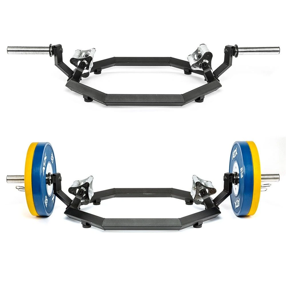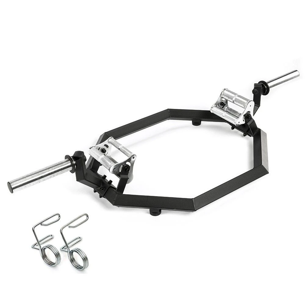 A rather unusual Trap/ Hex Bar, but one worth taking a second look at. Not only does the higher stance make it easier for loading and unloading, it also accomodates this rather unique multi-grip – 25mm, 38mm, 48mm – handle set-up. As trap bars are predominantly going to be used for grip-heavy work, such as deadlifts, shrugs, farmers walk, the handle thickness variation is a great feature and a bit of a leveller, if you have different abilities or size users working out together.